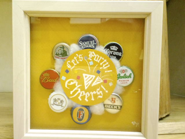 その周りに8個のビール瓶のフタを配置